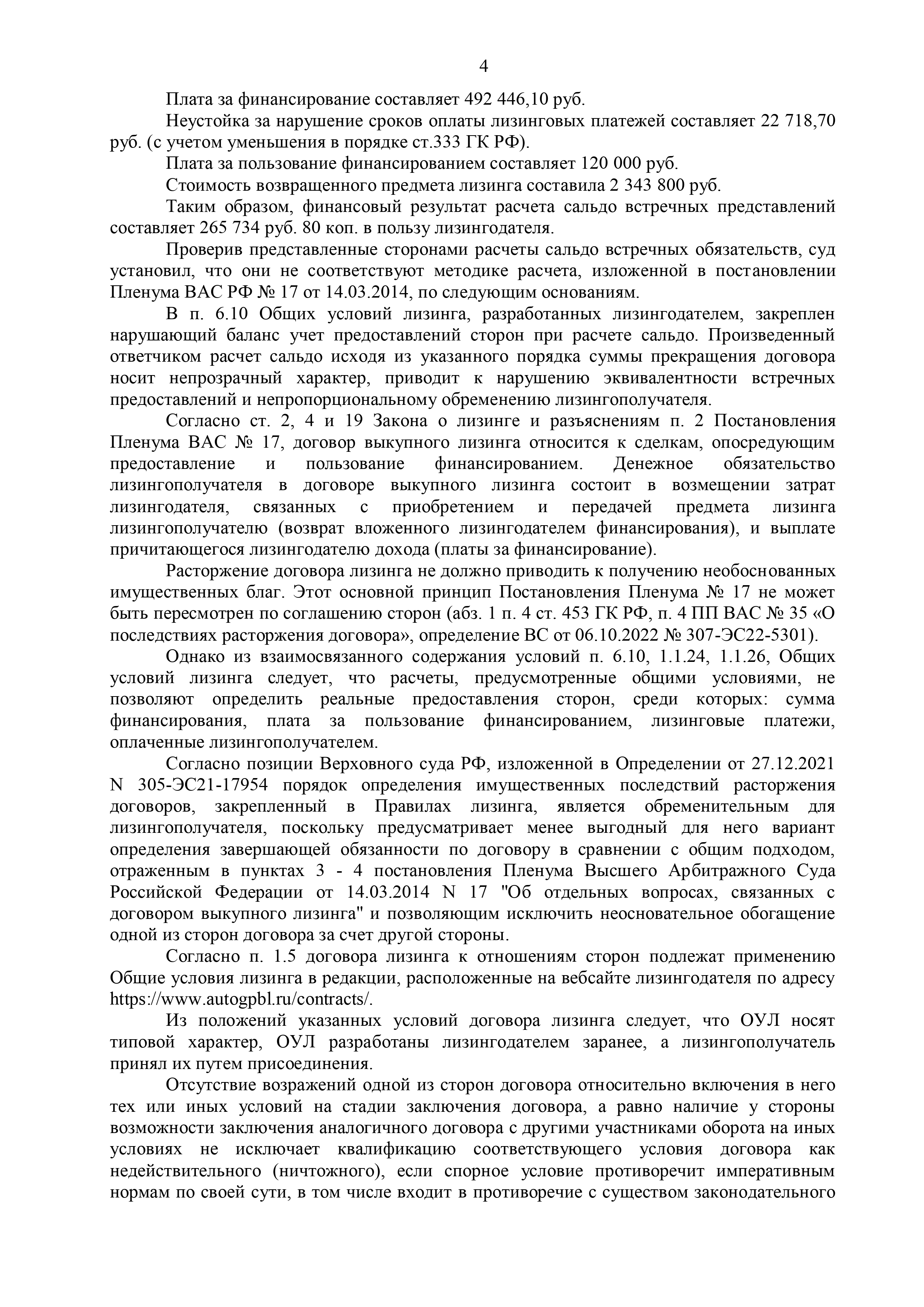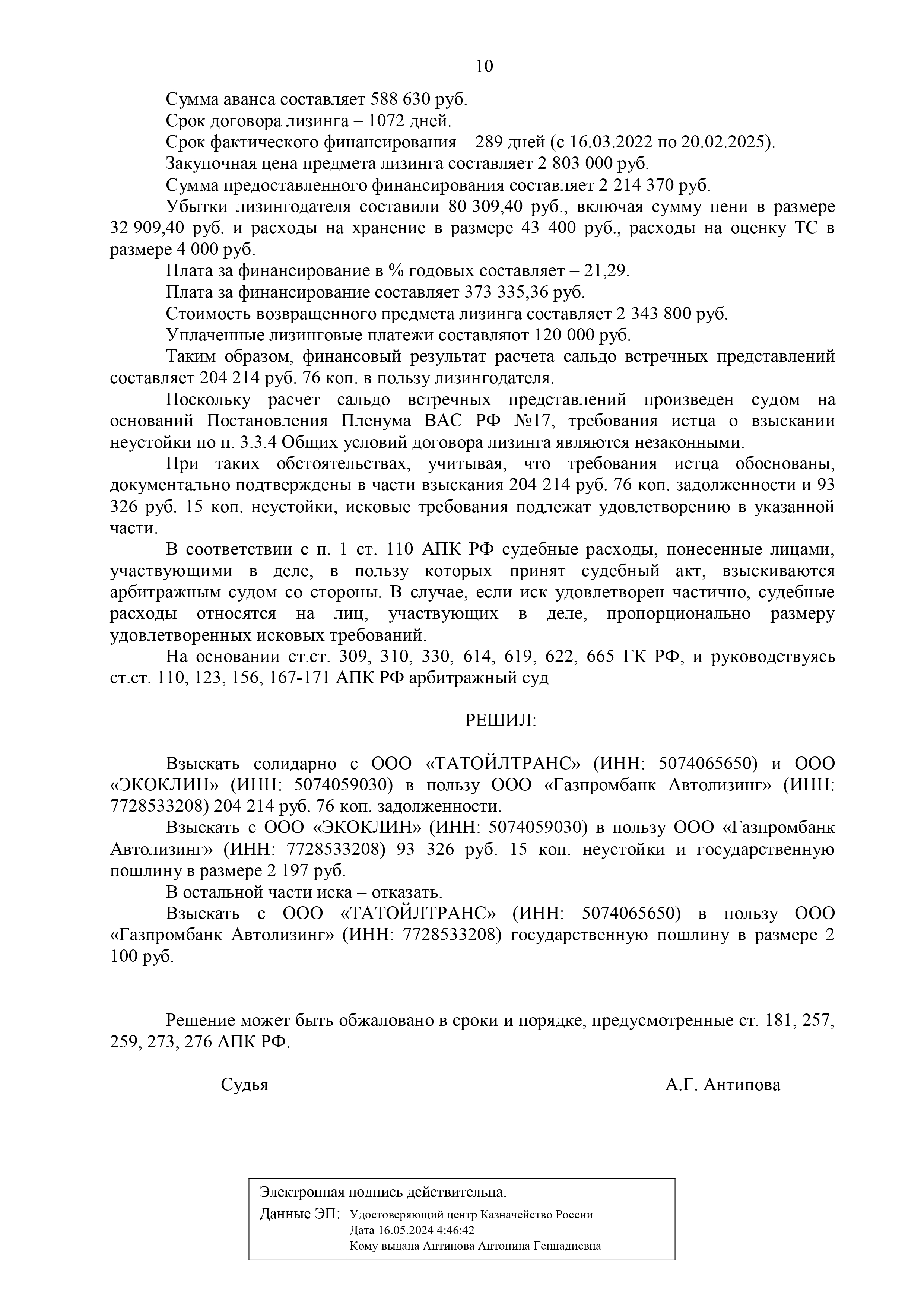 Суд уменьшил сумму взыскания до 207 000 руб. А также взыскал с ООО "Газпромбанк Автолизинг" часть судебных расходов в пользу нашего доверителя 90 000 руб.