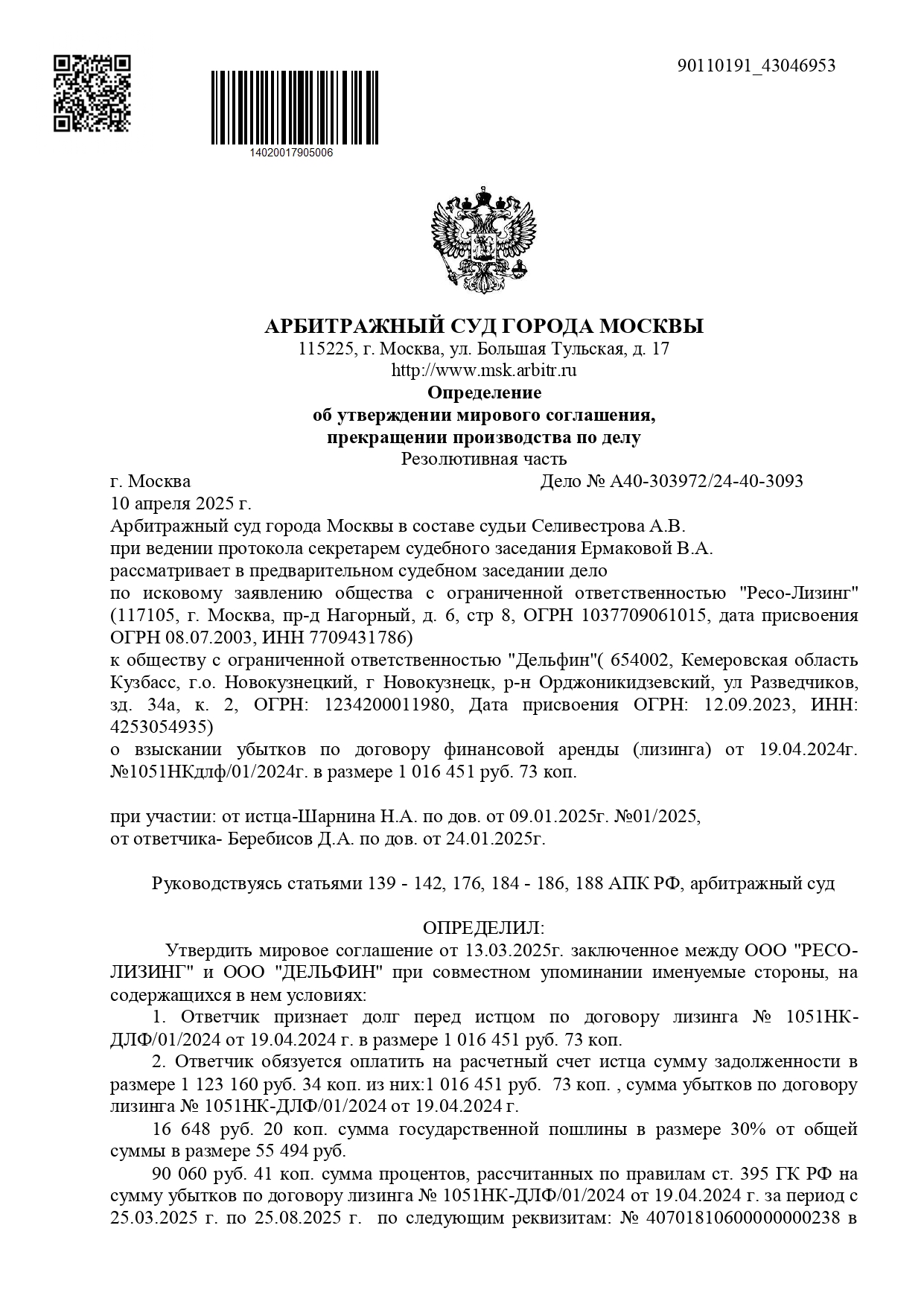 Заключили мировое соглашение в соответствии с которым мы должны выплатить лизингодателю 1 000 000 руб. вместо 2 832 978 руб., а также получили рассрочку на 7 месяцев.