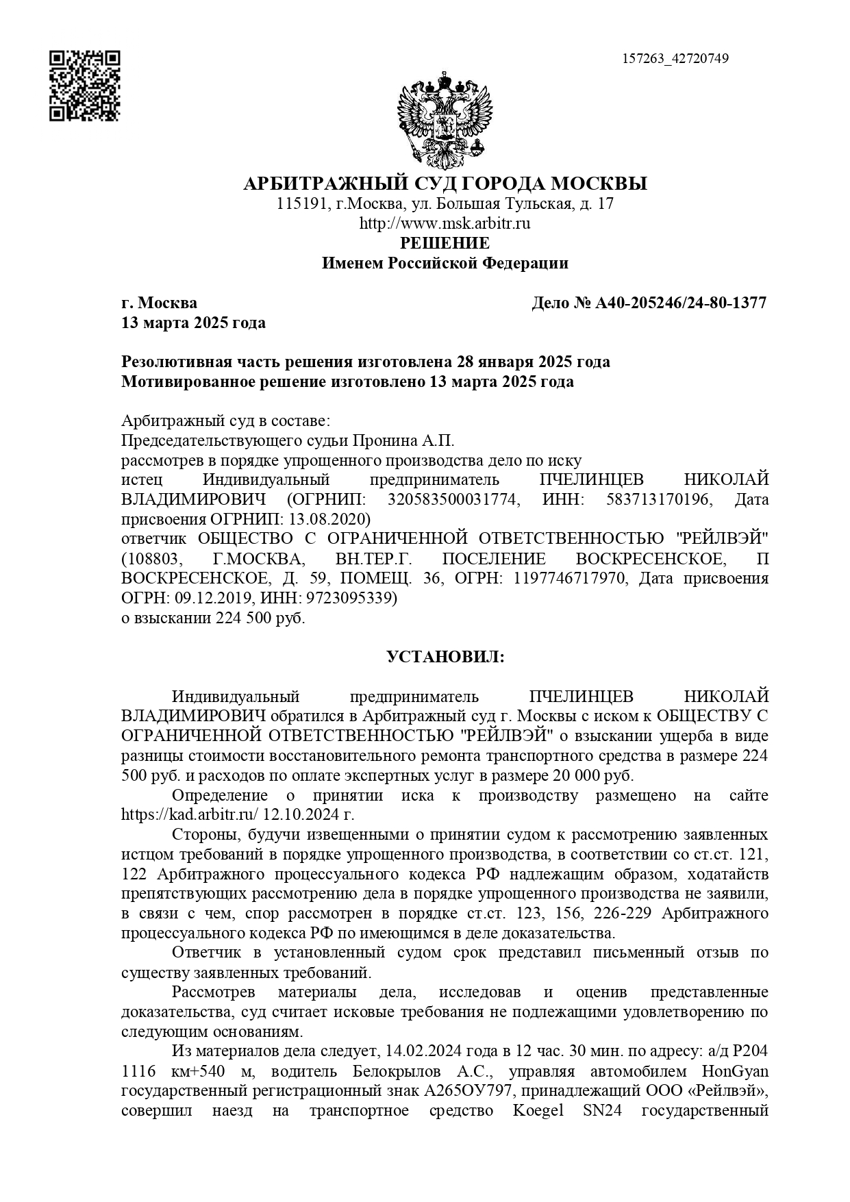 14 февраля 2024 года произошло ДТП с участием автомобиля нашего клиента. Индивидуальный предприниматель обратился в суд с требованием взыскать разницу между страховой выплатой и стоимостью восстановительного ремонта по оценке эксперта — 224 500 рублей, а также расходы на оценку — 20 000 рублей.