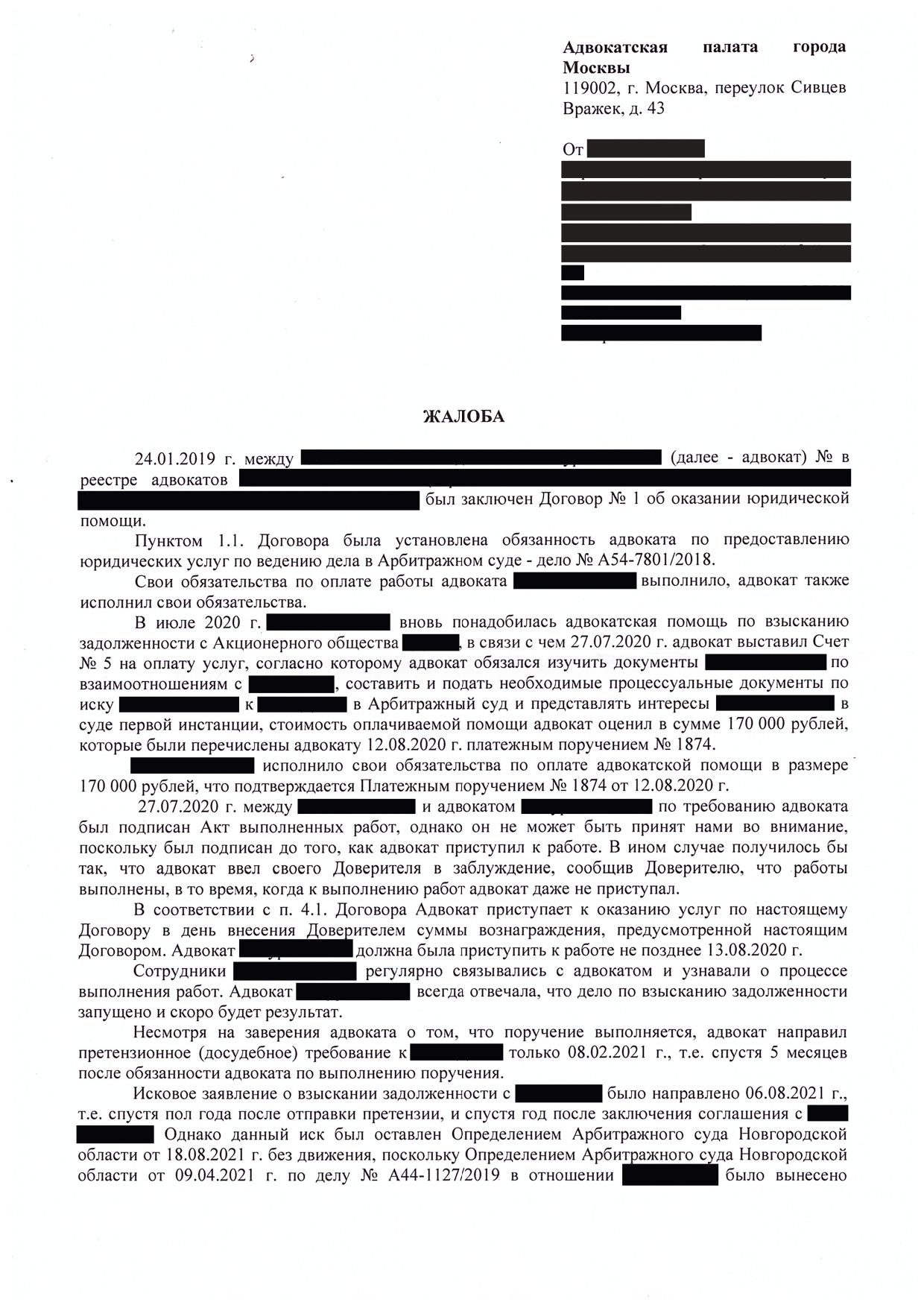 К нам обратилась транспортная компания с просьбой вернуть деньги у неблагонадёжного адвоката. Адвокат взял аванс в размере 170 000 руб. и не выполнил свои обязательства. А на претензии, со стороны нашего доверителя, ответил «отпиской»;