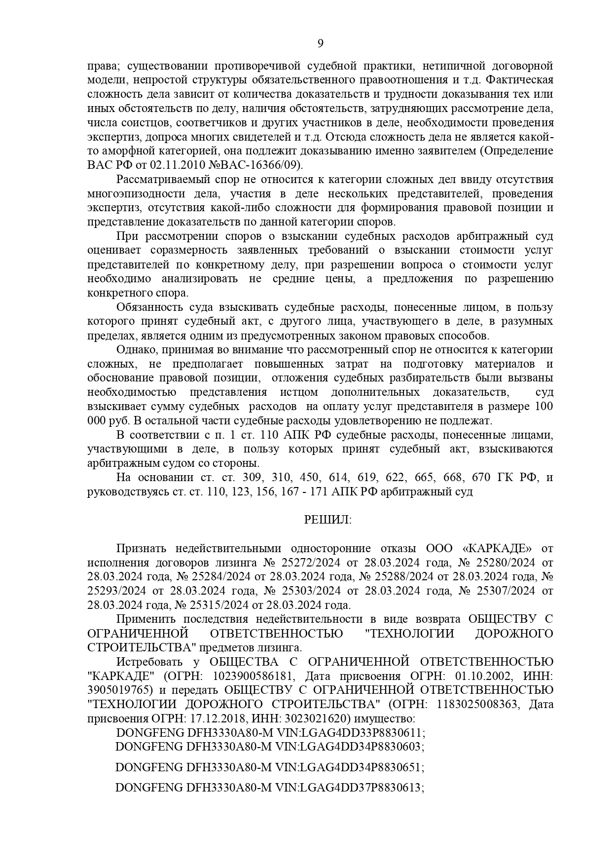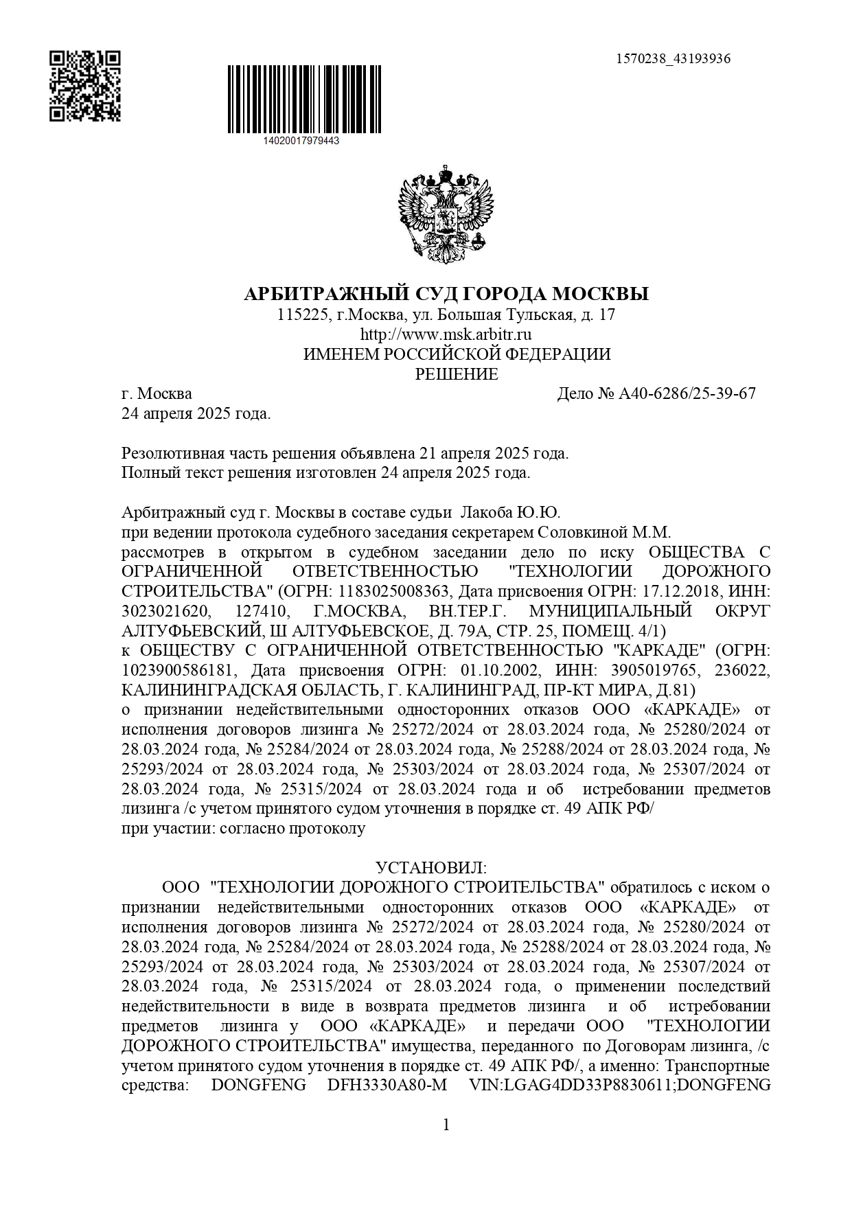 Суд признал недействительными односторонние отказы ООО «КАРКАДЕ» от договоров лизинга. И обязал лизингодателя вернуть нам технику.
