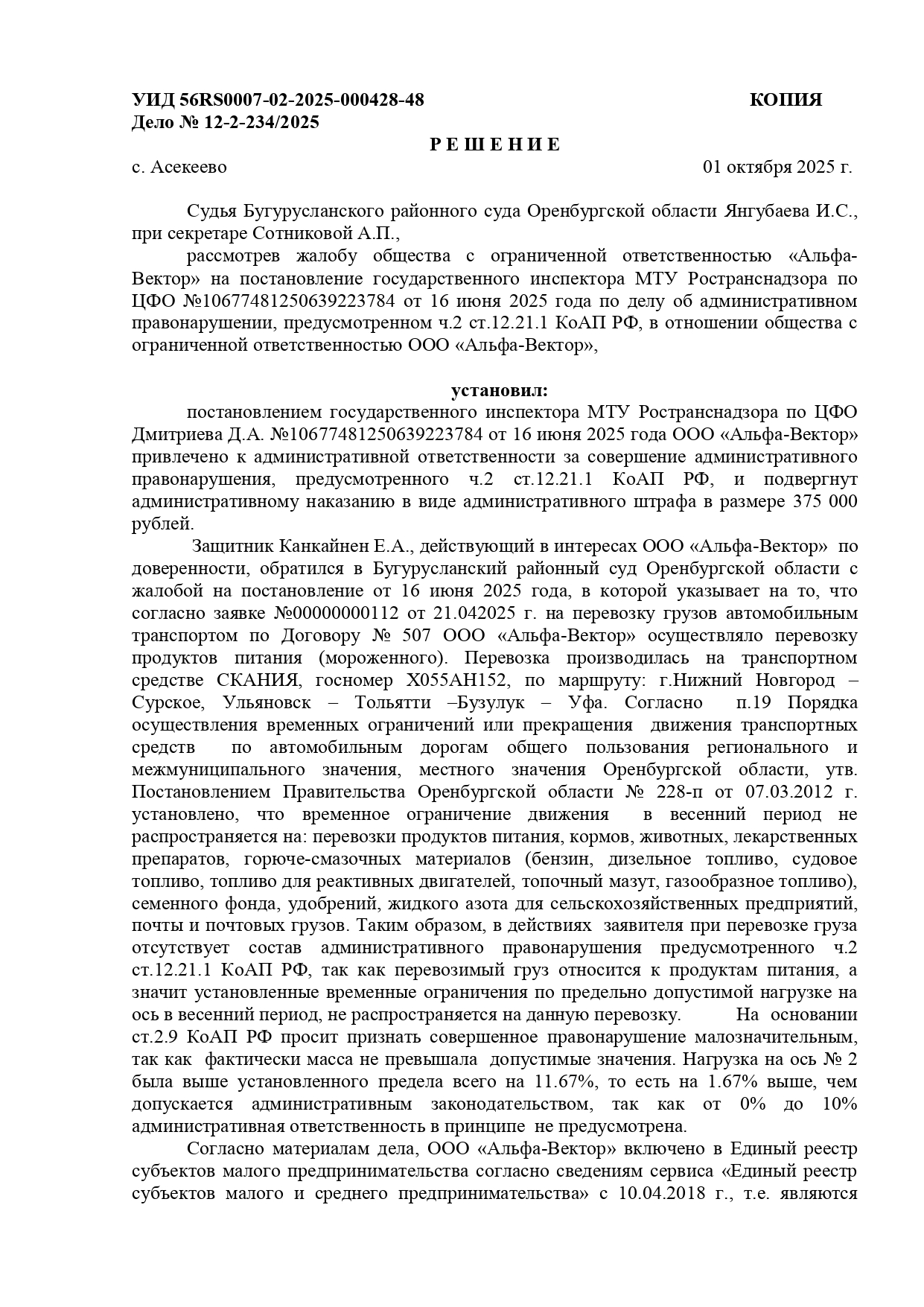 В соответствии с ч.2 ст.12.21.1 КоАП РФ нашего клиента привлекли к ответственности за перегруз ТС.