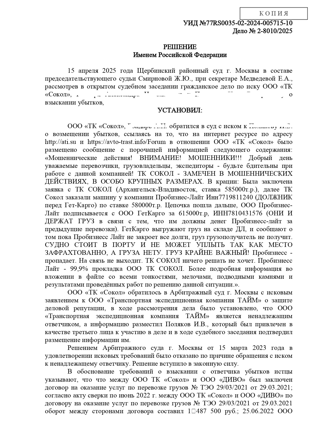 В добровольном порядке ответчик отказался удалять клевету с форума и выплачивать компенсацию.